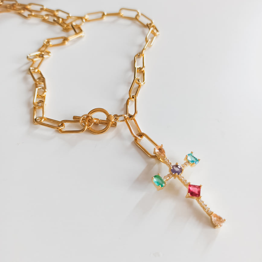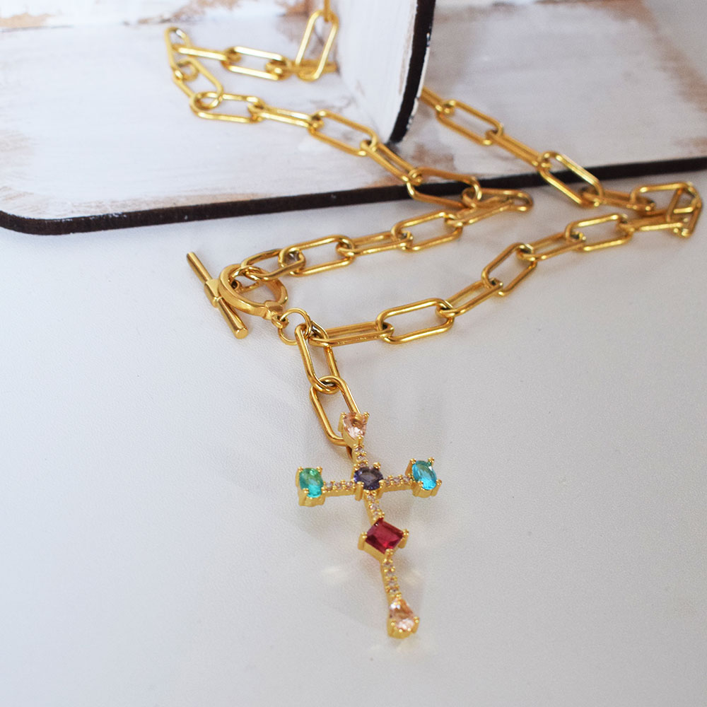 Ατσάλινο κολιέ με Σταυρό με πολύχρωμα ζιργκόν