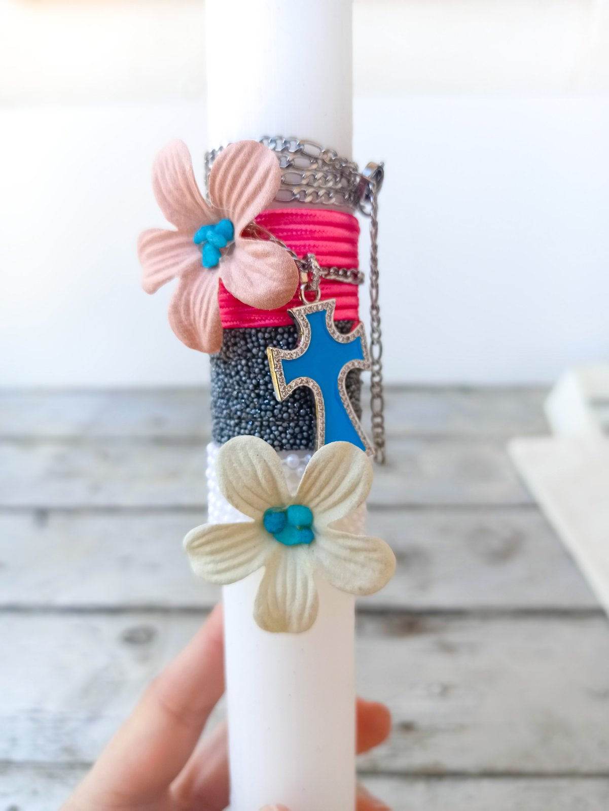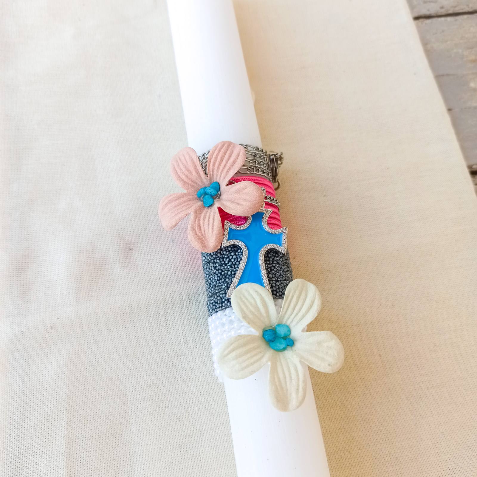 Χειροποίητη αρωματική λαμπάδα με κόσμημα , Σταυρός με σμάλτο γαλάζιο , ατσάλινη αλυσίδα – ορείχαλκος επιροδιωμένος