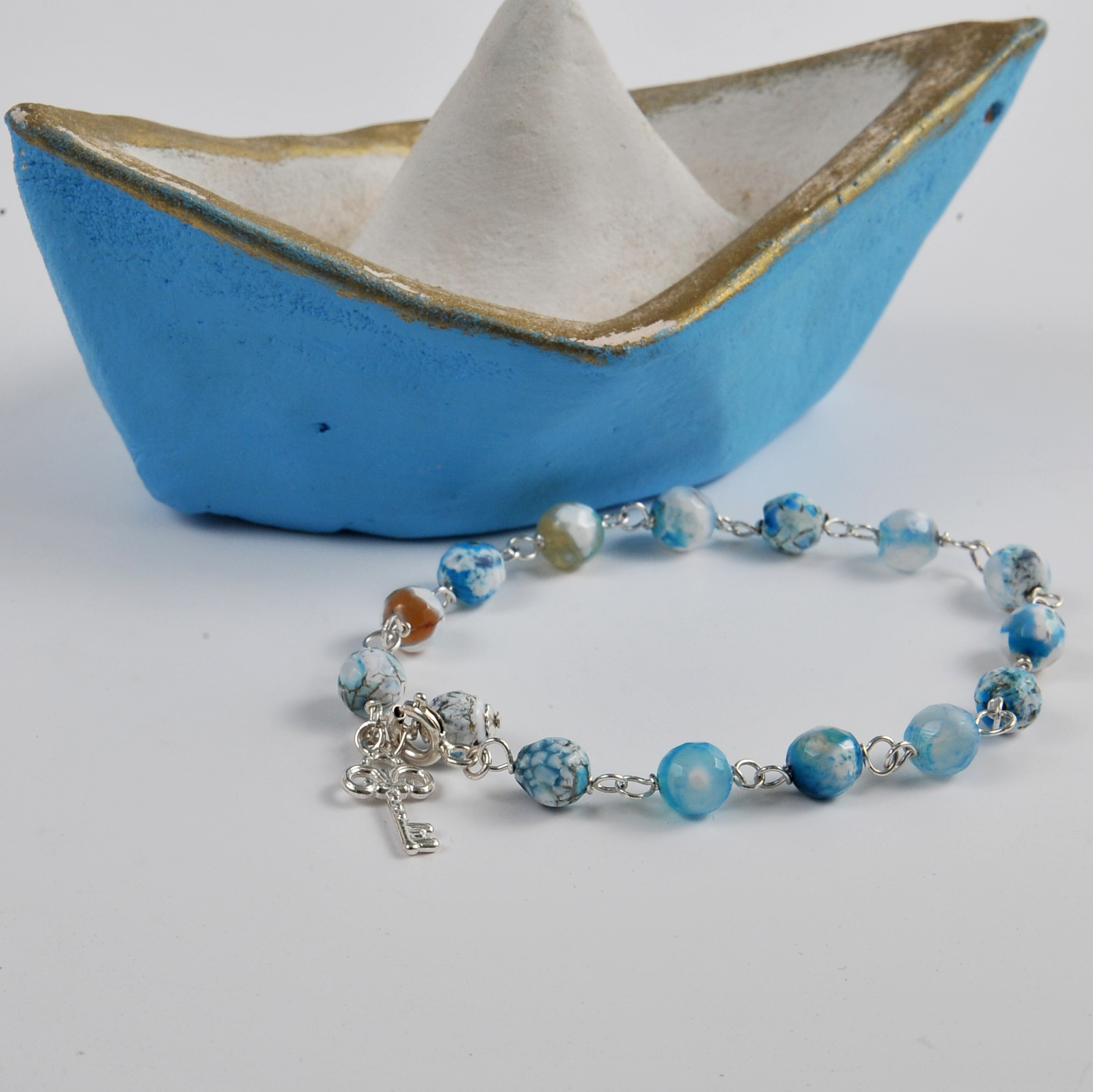 Χειροποίητο βραχιόλι ροζάριο από ασήμι 925 και χάντρες αχάτη 6mm μπλε. Ασημένιο μοτίφ κλειδί.