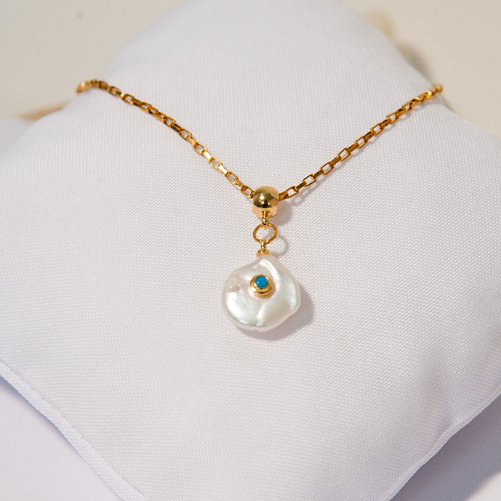 Ατσάλινο κολιέ σε αλυσίδα 60 εκ. επίχρυση με μεντγιόν από μαργαριτάρι φίλντισι με ζιργκόν κρυσταλλάκι σε χρώμα τυρκουάζ. Δεν οξειδώνεται.