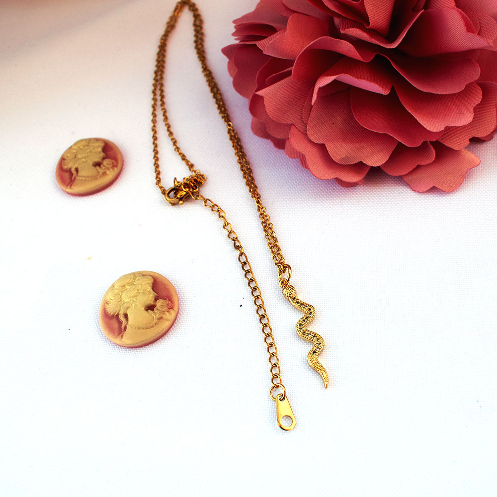 Ατσάλινο κολιέ επίχρυσο με μενταγιόν φίδι , από οικολογικό ορείχαλκο που δεν προκαλεί αλλεργίες (nickel free, cadmium free, lead free).Μακράς διάρκειας επιχρύσωμα , και κρύσταλλα ζιργκόν.