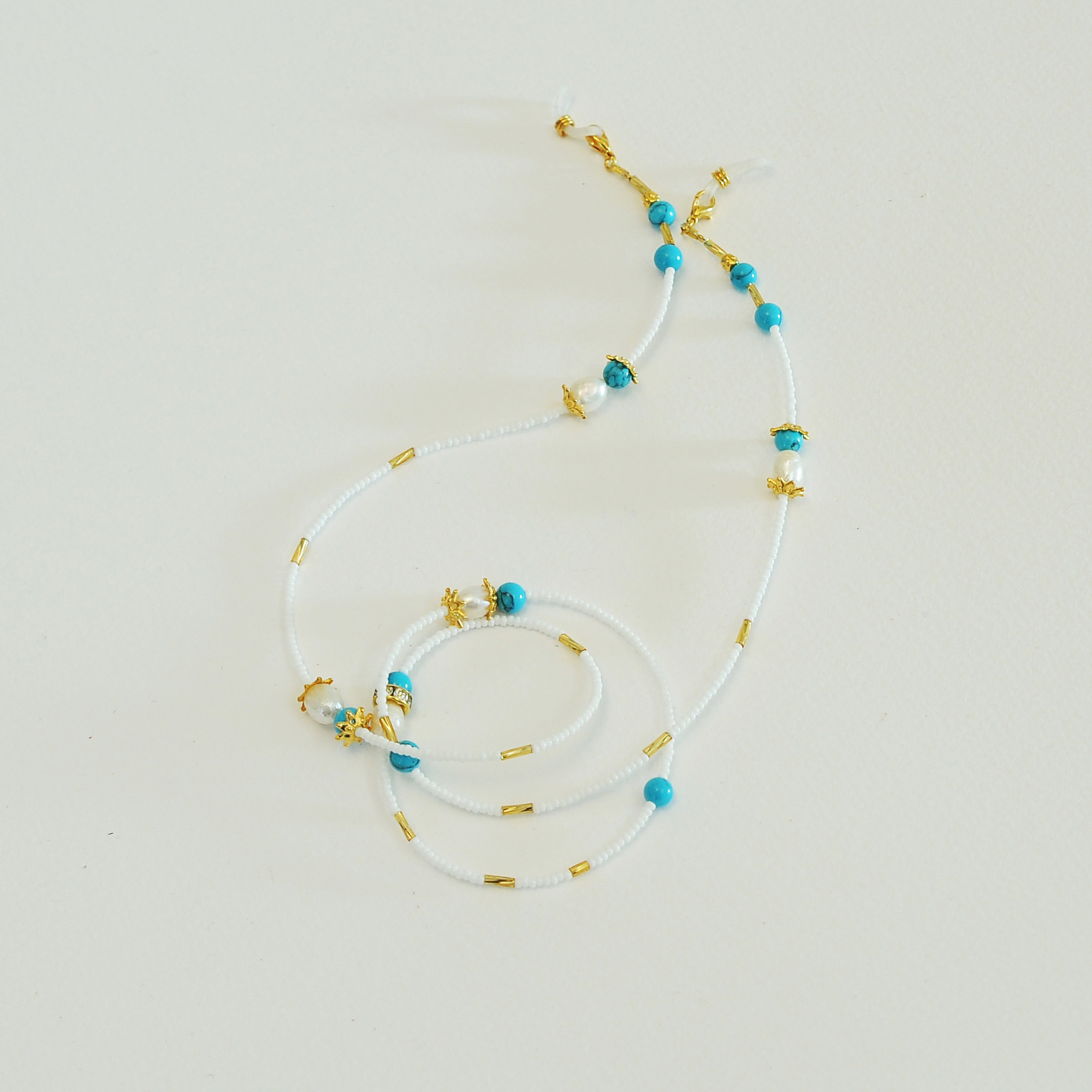 Με μικρές γυάλινες χάντρες άσπρες (seed beads) , μαργαριτάρια γλυκού νερού και χάντρες φυσικές τυρκουάζ.