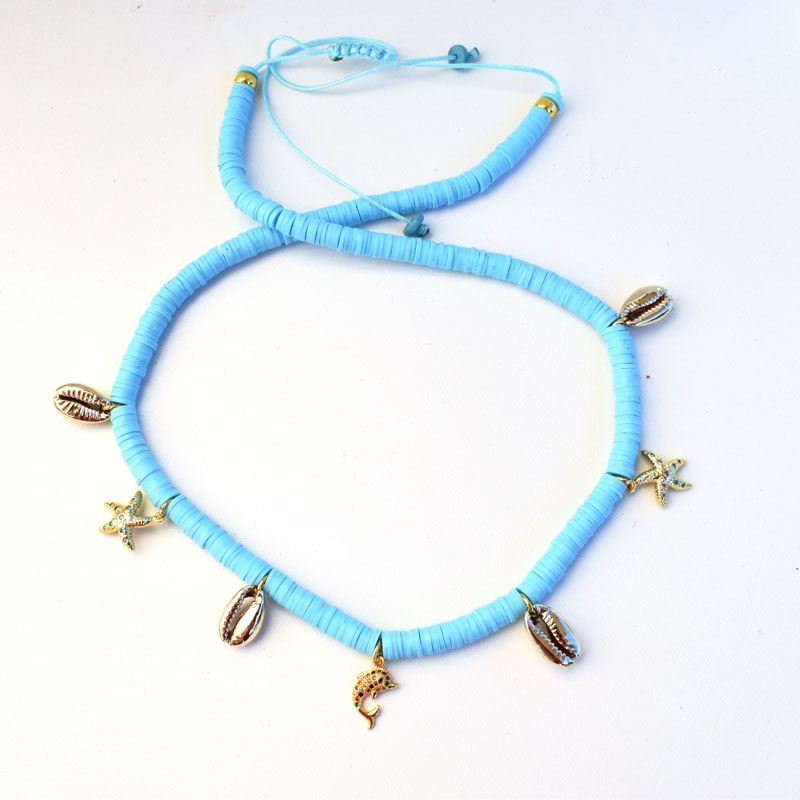 Χειροποίητο κολιέ με γαλάζιες χάντρες πολυμερικού πηλού , και διάφορα μενταγιόν με πολύχρωμα ζιργκόν και χρυσά κοχύλια