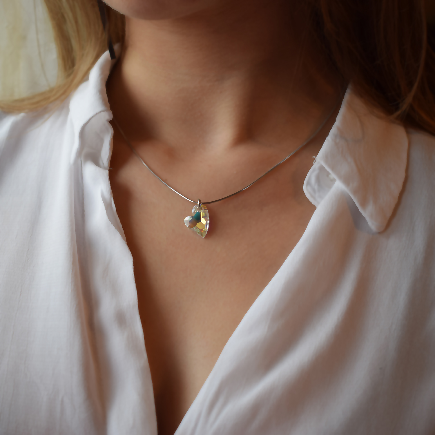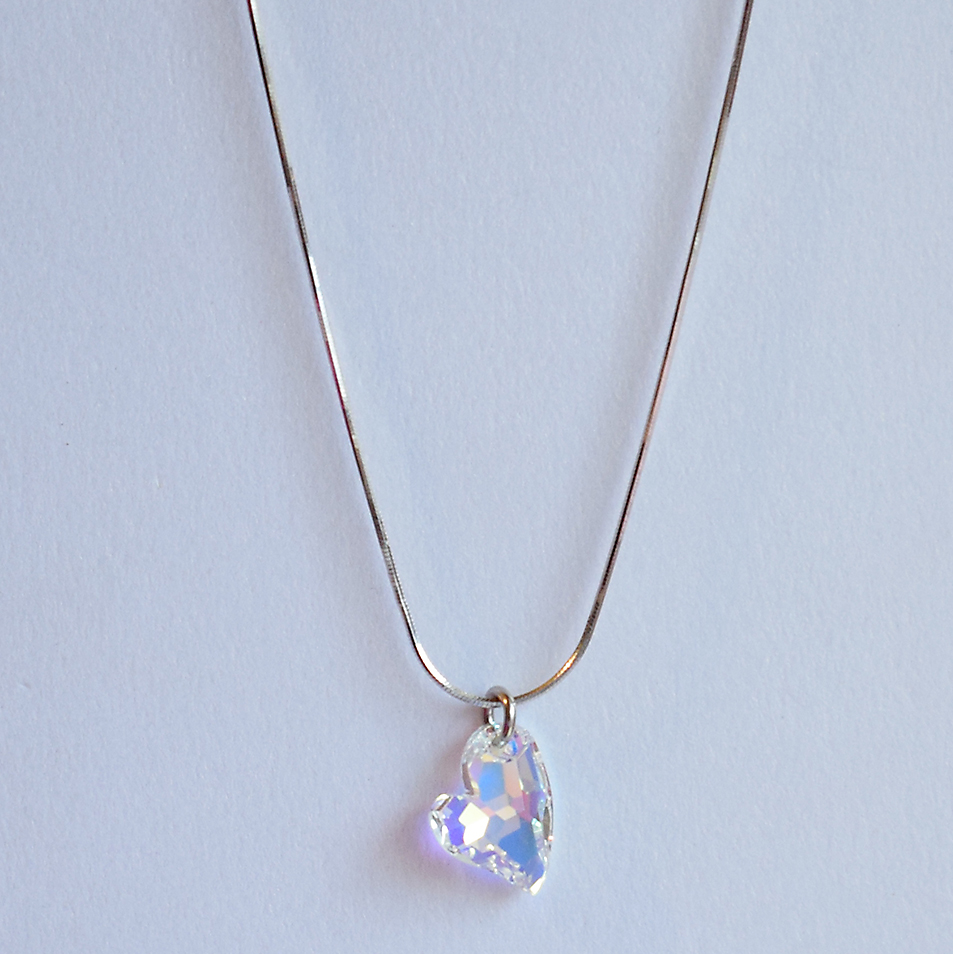 Κολιέ από Ασήμι 925 επιροδιομένο για να μη μαυρίζει, με κρύσταλλο καρδιά SWAROVSKI 6261 DEVOTED 2U 17mm, crystal AB. Η αλυσίδα είναι τύπου snake (φίδι) 2 mm