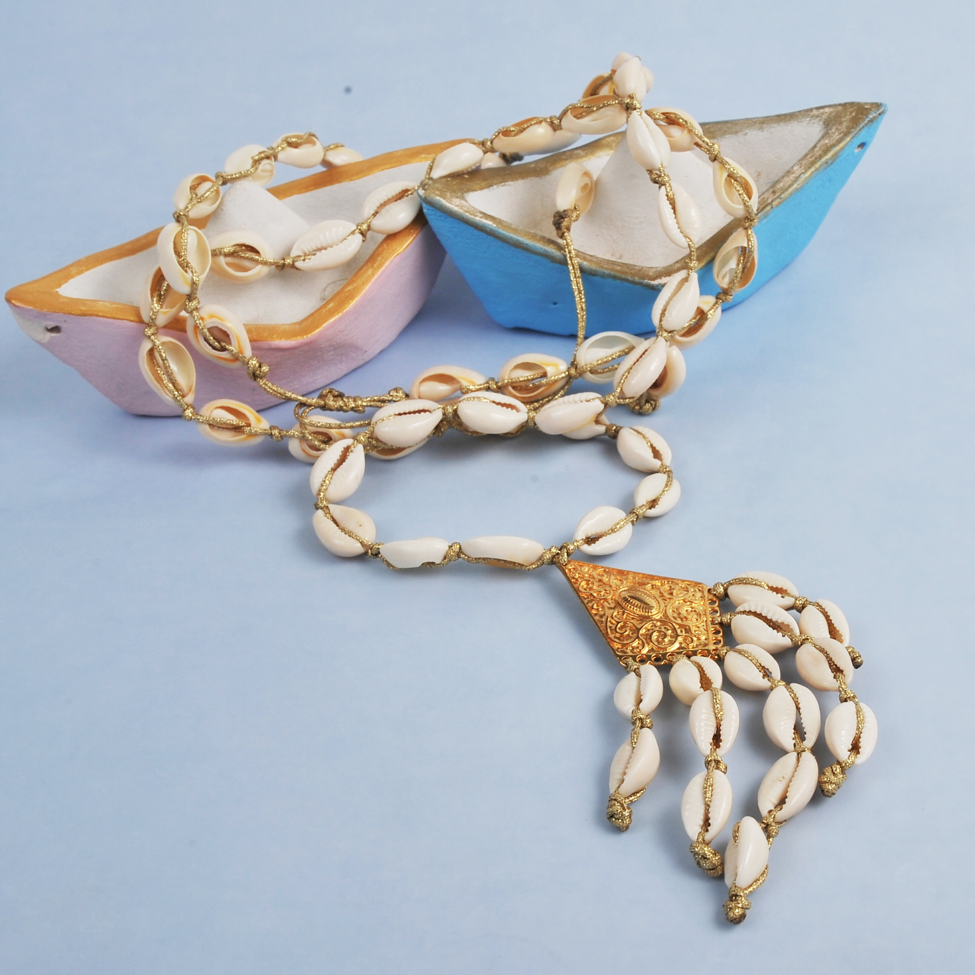 Χειροποίητο μακρύ κολιέ με κοχύλια και μεταλλιζέ κλωστή χρυσή . Επίχρυσο ορειχάλκινο μεταλλικό αρχαιοελληνικό στοιχείο.