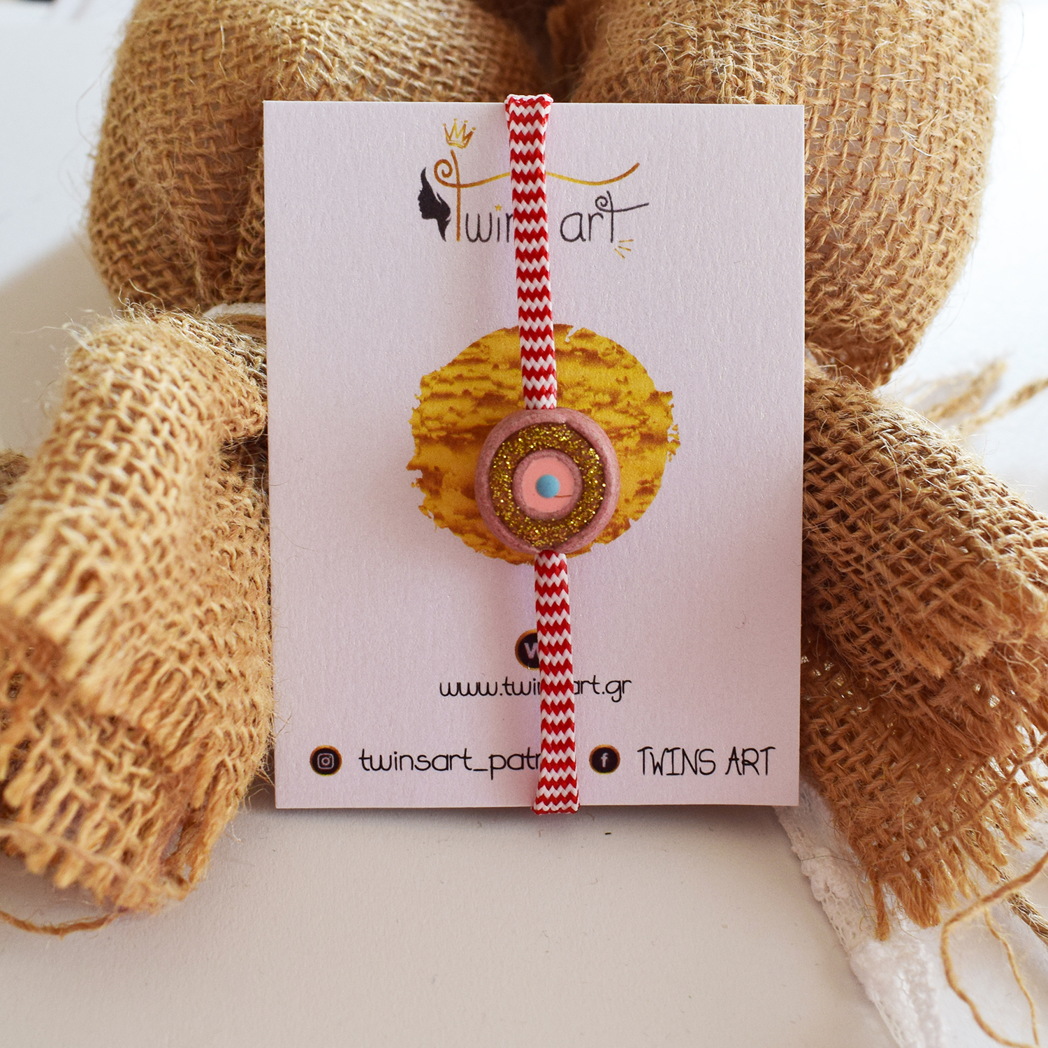 Χειροποίητο μαρτάκι με κεραμικό ροζ ματάκι και γκλίτερ περαστό σε πλακέ κορδόνι , κλείσιμο με καβουράκι