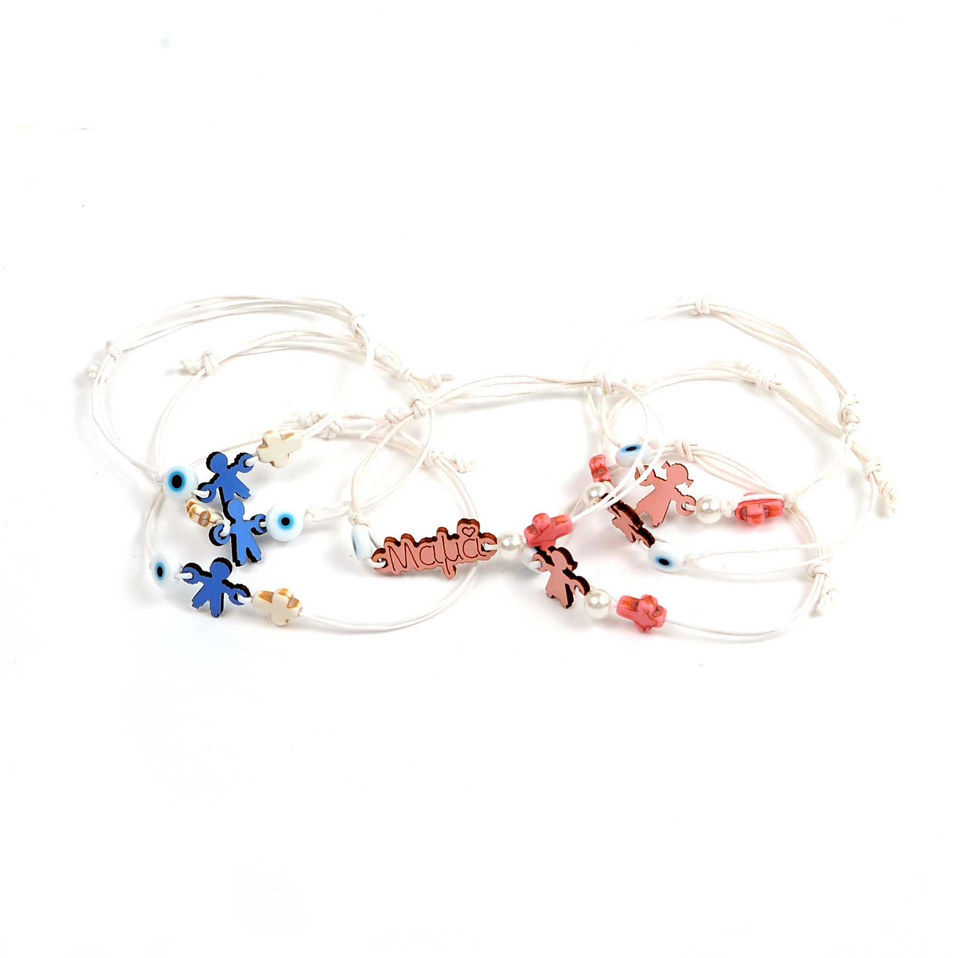Χειροποίητα μαρτυρικά βάπτισης ξύλινες φιγούρες αγόρι – κορίτσι σε λευκό κορδόνι , γυάλινο ματάκι και σταυρός από χαολίτη.