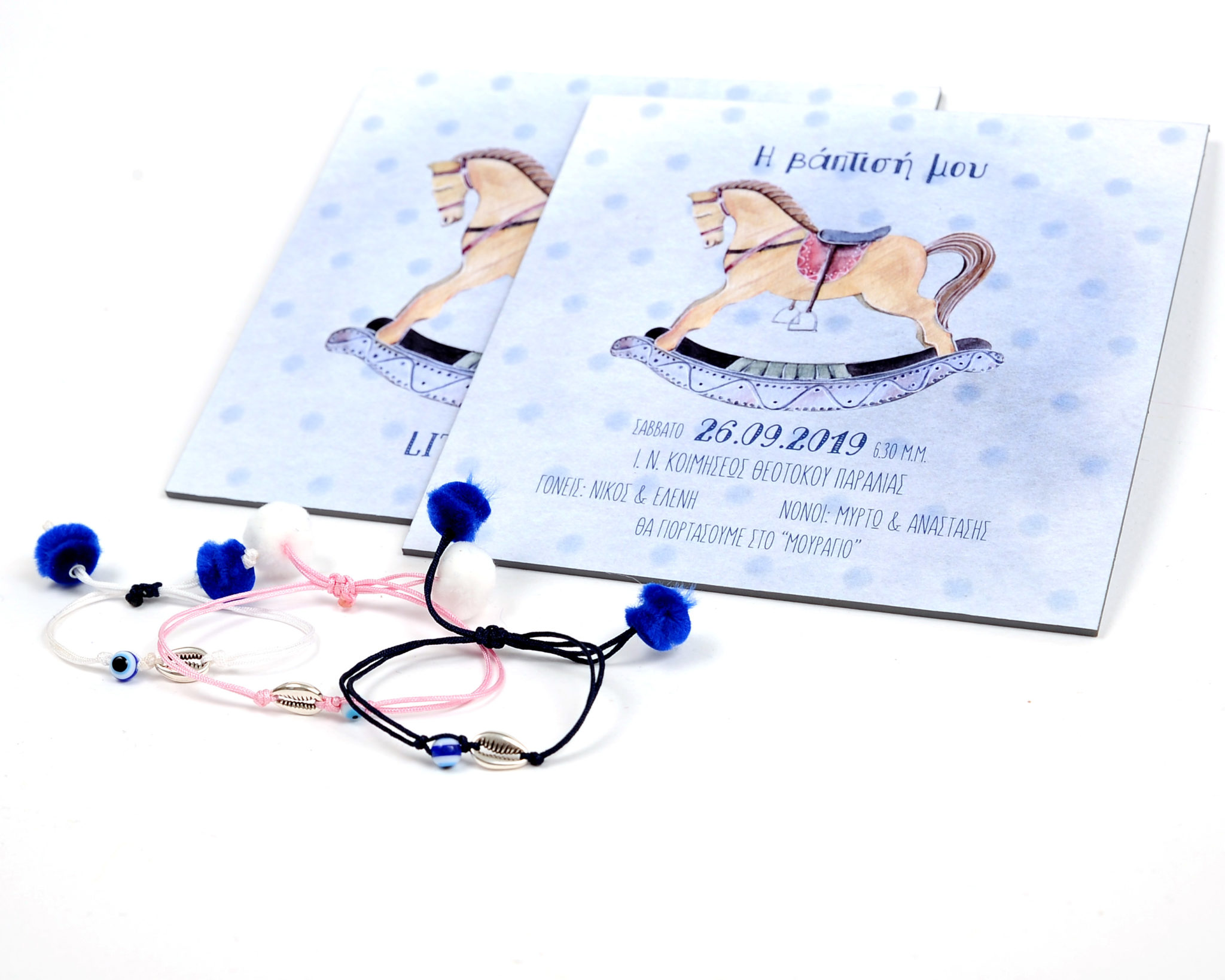 Χειροποίητα μαρτυρικά βάπτισης με κοχύλι ,ματάκι γυάλινο σε κορδόνι ροζ -λευκό – σκούρο μπλε και πομ πομ