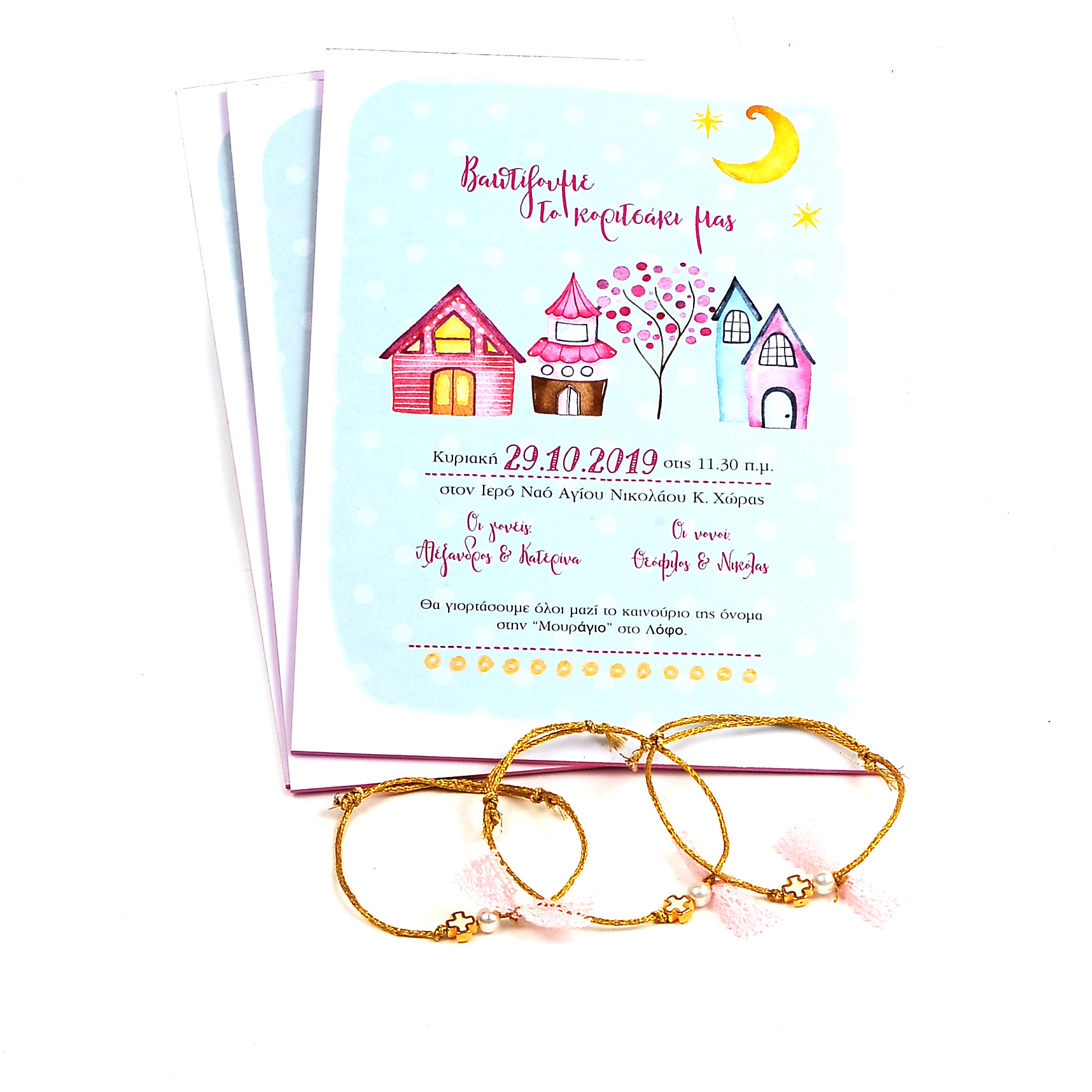 Χειροποίητα μαρτυρικά βάπτισης Σταυρός με λευκό σμάλτο , πέρλα με μεταλλιζέ κορδόνι χρυσό και ροζ δαντέλα φιόγκος.