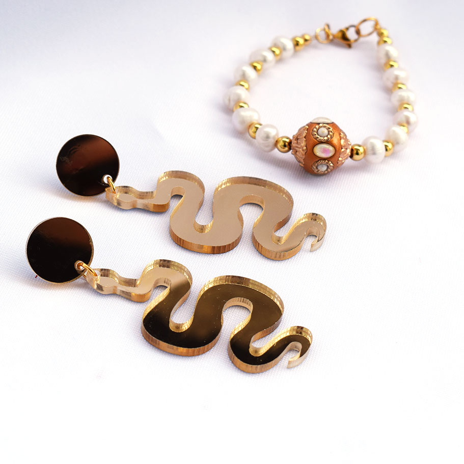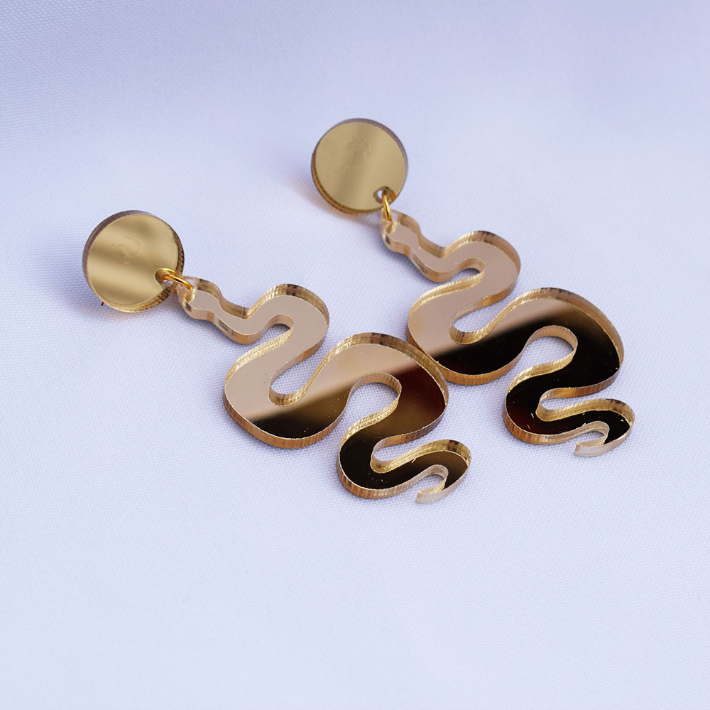 Σκουλαρίκια σε σχήμα φίδι από plexi glass χρυσό καθρέφτη.