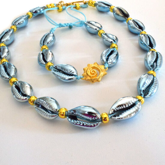 Κολιέ τσόκερ με μπλε επιμεταλλωμένα κοχύλια και αιματίτη